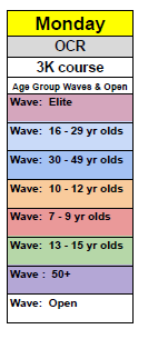 Elite Class starts at 8am. Every minute two runners start. 8am, 8:01, 8:02 etc… This way there is less congestion at obstacles by being spread out.